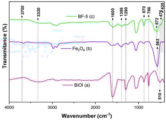 The composition and chemical bonding of the synthesized structures were studied using FT-IR. As shown in Figure 7, the FT-IR spectra of pure BiOI show specific IR bands assigned to the BiOI structure between 510 cm−1 and 1300 cm−1. This is how the characteristic peaks of the tetragonal crystalline bonds of BiOI are observed at 510 cm−1 and at 766 cm−1, which demonstrate the asymmetric stretching vibration of the Bi-O bond []. Similarly, the bands observed around 3700 cm−1 at 1600 cm−1 belong to the stretching and bending vibrations of the hydrogen-bonding -OH group, which are also visualized in the spectrum of BF-5 []. The IR of Fe3O4 shows two typical bands, one at 430 cm−1 and another one at 563 cm−1, which are attributed to the stretching vibration of the Fe-O bond in octahedral sites (Fe2+-O) and octahedral and tetrahedral sites (Fe3+-O) [], respectively. These bands were shifted to higher wavenumbers, corresponding to 476 cm−1 and 572 cm−1, after the magnetite was coated with BiOI []. The vibration at 1395 cm−1 corresponds to hydroxyl groups, which is also observed in the spectrum of BF-5 []. The infrared spectrum of BF-5 compared to the IR of the pure BiOI shows a difference in the region of 450 cm−1 to 580 cm−1, indicating the stretching vibration of the bonding bands due to the interaction that occurs by the adhesion of BiOI on the Fe3O4 surface []. In addition, specific absorbance bands assigned between 870 cm−1 and 1290 cm−1 are observed in both IR spectra (curves a and c), which demonstrate the asymmetric stretching vibration of the Bi-O [].