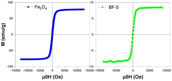 Figure 8 shows the magnetic field response properties of the synthesized materials Fe3O4 and BF-5 through the typical hysteresis loops. The saturation magnetization value for Fe3O4 was 78 emu/g and decreased to 9 emu/g for BF-5 after the BIOI coated the magnetite particles, showing almost zero coercivity and remanence of the magnetization curve, findings that agree with those of Kim et al. []. The magnetic saturation value of BF-5 is sufficient to separate it from the aqueous solution with a magnet at 89.4% after the photocatalytic degradation of caffeic acid; the low magnetic remanence is desired because, when the external magnetic source is removed, the BF-5 is easily released.