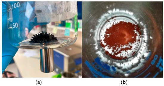 Fe3O4 and BiOI/Fe3O4 were synthesized using the solvothermal method following the reported procedure. The synthesized magnetite is shown in Figure 9a, and the BiOI/Fe3O4 photocatalyst in Figure 9b.