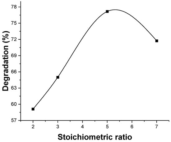 The synthesis of BiOI/Fe3O4 was carried out using the solvothermal method. A total of 3 mmol of bismuth nitrate pentahydrate (Bi(NO3)3·5H2O, 99.0%) was dissolved in 80 mL of ethylene glycol. Once the solution was prepared, different proportions of magnetite (Fe) were added, and the solution was mechanically stirred (70 rpm) for 60 min. Without stopping the stirring, a solution of 3 mmol of potassium iodide (KI, 99.0%) in 80 mL of ethylene glycol was added drop by drop into the mixture (BiOI/Fe3O4). After adding the KI solution, it was left with mechanical stirring for 15 min at room temperature. Once the time was up, the mixture was transferred to a Teflon-lined autoclave reactor and heated to 160 °C for 8 h [,]. Four stoichiometric ratios between BiOI/Fe3O4 were evaluated in triplicate: 2:1, 3:1, 5:1, and 7:1. The response factor was the degradation rate (%) of the model compound.
