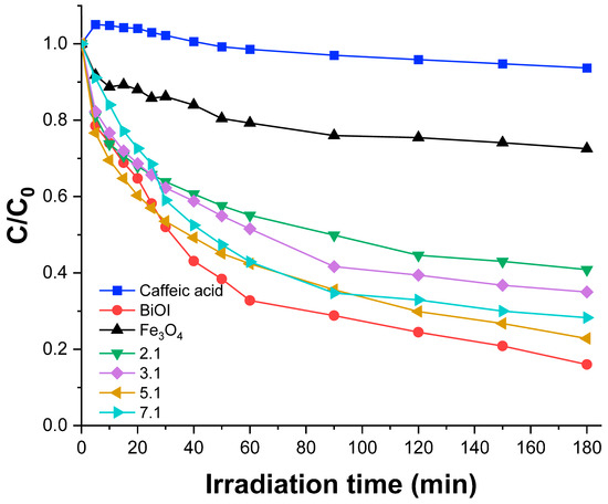 Considering this background, four stoichiometric ratios between Bi/Fe: 2:1 (BF-2), 3:1 (BF-3), 5:1 (BF-5), and 7:1 (BF-7) were evaluated in this study (Figure 11), the results of which indicated that the most favorable stoichiometric ratio was the 5:1 ratio (Figure 10). Control experiments were also carried out to evaluate the photocatalytic activities of the pure compounds of BiOI and Fe3O4, as the degradation of caffeic acid without a catalyst in suspension was also measured under simulated visible light radiation using 25W LED lamps. This compares the photocatalytic performance of the BiOI/Fe3O4 heterostructures synthesized after 180 min of reaction.