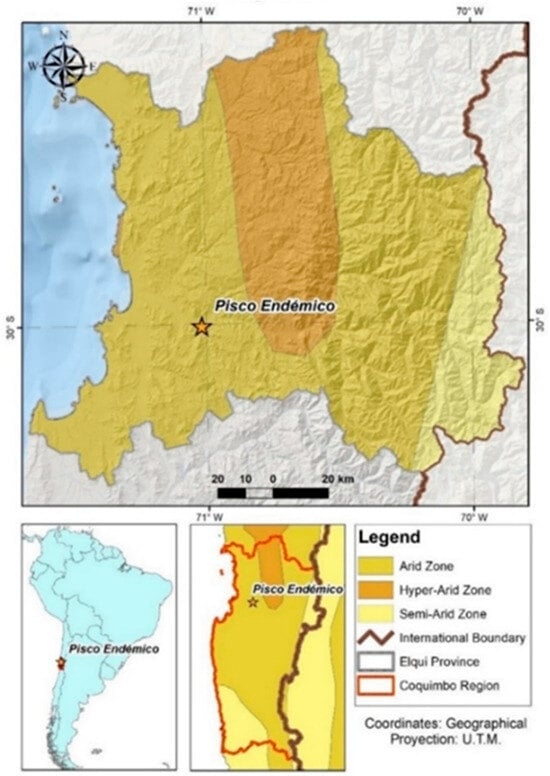 The Coquimbo region comprises a hyper-arid, arid, and semi-arid zone from north to south is located in a transition zone between the Mediterranean area of Chile to the south and the Atacama Desert to the north []. This region has 94% of the pisco production vines in Chile [] and faces a significant water crisis [,], where the LIW the wine and pisco industry generated could potentially be reused. In this sense, the reuse of treated wastewater can help face future problems of water scarcity if subjected to adequate treatment so that it can be used in diverse productive activities in the agricultural, mining, and industrial sectors []. The pisco company that provided the information for this evaluation is Pisco Endémico, located at Parcela 18, Fundo Titón, Valle de Elqui, Chile (Figure 12).