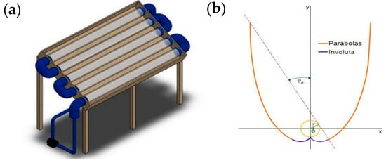 The economic viability of phenolic compound degradation was simulated using a magnetically recoverable BiOI/ Fe3O4 photocatalyst. The Composite Parabolic Solar Concentrator (CPC)-type photocatalytic system was selected as a good option to achieve high percentages of photodegradation due to its reflective geometry [], based on parabolic and involute sections to increase their efficiency (Figure 13). The CPC has great potential to be implemented in Pisco Endémico, given that this small industry generates a maximum amount of 1167 L/month of wastewater in its pisco production.