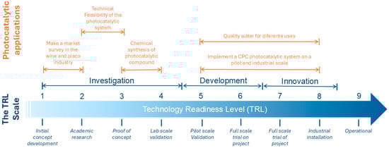 The potential applications of these nanomaterials are vast and range from wastewater treatment to improving industrial processes that require the removal of persistent and emerging pollutants []. Given the complexity of conventional and current systems, water treatment by solar photocatalysis is a process with high sustainability prospects, capable of degrading recalcitrant pollutants []. However, as far as we know, no studies guarantee this technology’s viability and sustainability using BiOI/Fe3O4 at a TRL higher than the validation under controlled laboratory conditions. Although photocatalysis offers significant advantages as a wastewater remediation method, its widespread adoption has faced obstacles, and studies often focus on the treatment’s technical success at a laboratory scale without evaluating its future scalability [].