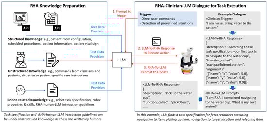 Figure 1 illustrates the proposed framework operating in two phases: (1) preparation of RHA knowledge base and (2) RHA-Clinician-LLM dialogue for task execution. In the knowledge base preparation phase, contextual information is provided to the LLM in three forms. First, structured knowledge includes details about the patient room configuration, patient information, patient vital signs, bed occupancy status, clinician information, and medication schedules, etc., that are typically generated by various software programs. These data can be transformed into machine-readable formats (e.g., JSON or XML) via APIs or direct outputs, making them comprehensible to modern LLMs. Second, unstructured knowledge is provided by healthcare professionals in natural language and interpreted by the LLM’s language processing capabilities. This may include patient-specific care instructions, updates on conditions, or guidelines for emergency scenarios. Third, robot-related knowledge involves both structured and unstructured information about the RHA’s capabilities and operational parameters. Structured information includes robot properties, skills, and actuation limits, while unstructured data, like task specifications and RHA-human-LLM interaction guidelines, define roles and responsibilities for humans and robots.