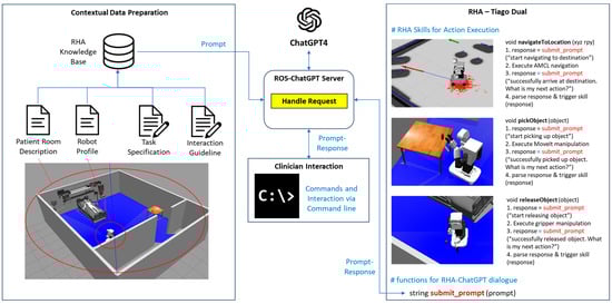 For the implementation of the framework outlined in Figure 1, this section describes the development of a prototype software program that incorporates ROS and ChatGPT4 to enable the autonomous operations of the RHA in simulated patient room environments (Figure 2).
