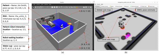(a) Gazebo patient simulation with RHA, (b) RHA internal data visualized in RVIZ.