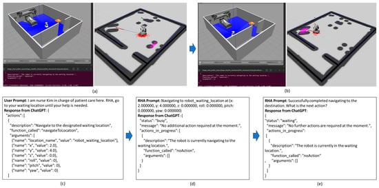 After all the contextual information is provided, the first user prompt is submitted via a terminal: “I am Nurse Kim in charge of patient care here. RHA, go to your waiting location until your help is needed”. As shown in Figure 4c, ChatGPT generates a type 1 response, triggering the existing “navigateToLocation” skill. ChatGPT effectively identifies the appropriate skill, retrieves the properties of the robot’s waiting location, and converts this information into JSON format, which is parsed by the RHA for execution. Once the navigation begins, as depicted in Figure 4d, the RHA submits the prompt: “Navigating to robot_waiting_location at…” and receives a type 2 response indicating that no further action is required during the navigation process. Upon successfully reaching the destination, the RHA submits another prompt: “Successfully completed navigating to the destination”, which results in a type 2 response: “The robot is currently in the waiting location. No further actions are required at the moment”.