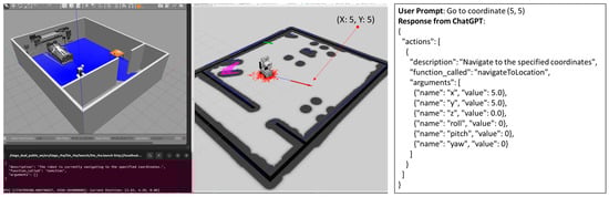 The next experiment involved directly providing a coordinate, rather than a predefined contextual location name, to test the RHA’s ability to interpret and navigate to arbitrary points. As shown in Figure 5, the user submitted the prompt: “Go to coordinate (5, 5)” via the terminal. ChatGPT responded with a type 1 response, triggering the “navigateToLocation” skill, which parsed the coordinates into JSON format for the RHA. As the robot began navigation, it submitted a prompt indicating its action, followed by a type 2 response from ChatGPT confirming that no further action was required during the ongoing navigation. This experiment demonstrated the RHA’s ability to handle arbitrary coordinate inputs in its command execution process.