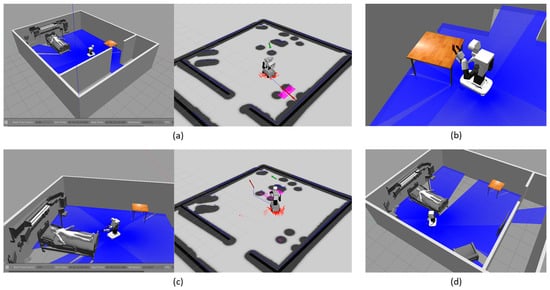 As shown in Figure 3a, the Gazebo simulation initializes the patient room environment and spawns the RHA at a predetermined location. Figure 3b illustrates the RHA’s internal representation of the environment and data streams, which utilizes the ROS AMCL libraries [] for localization and navigation and MoveIt! libraries [] for arm manipulation. The essential inputs for AMCL include a 2D map of the room and the robot’s initial pose. The 2D map was generated using the PGM map creator [], taken directly from the Gazebo simulation of the patient room without the robot spawned. To ensure that the robot’s internal work representation aligns accurately with the Gazebo simulation environment, the map generated from the PGM creator was adjusted in both location and orientation to match the Gazebo simulation’s coordinate system. This step is crucial for ensuring that the robot can accurately interact with its environment. A similar effort would be required when implementing this system with a real robot in a patient room. This study does not include sensor-based perception of the environment utilizing object detection and localization. Instead, all relevant inputs are provided through prompts and contextual information provided (information in appendices) and by directly accessing model data within the Gazebo simulation. This approach enables the case study to focus on evaluating the robot’s ability to adaptively plan its operations without relying on hardcoded logic, relying solely on its interaction with ChatGPT-4.