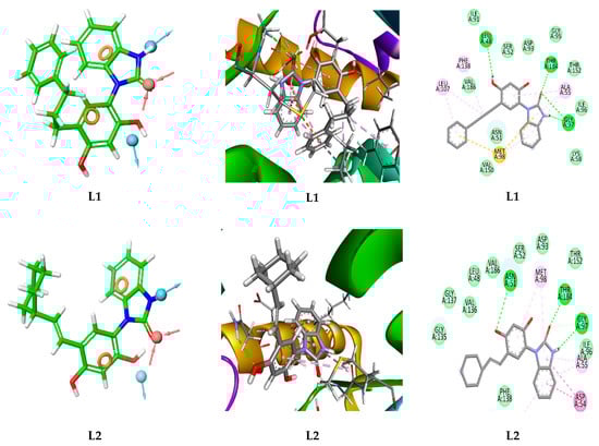 The ability of an active substance to inhibit certain enzymes is of crucial importance in the development of new drugs and in clinical applications. To better understand a compound’s pharmacokinetic characteristics and maximize its therapeutic application, it is important to determine which enzymes it inhibits. Based on the data in Table S5, all compounds may be potent cytochrome P450 (CYP) inhibitors. All compounds exhibited moderate renal clearance, with values ranging from 6.567 to 11.818. Compound L5 exhibited the highest value. With the exception of compound L4, which had a low value of 0.051, all compounds have an intermediate half-life (T1/2), ranging from 0.568 to 0.892. It is important to remember that drugs with short half-lives and poor clearance are generally excreted comparatively quickly [,].