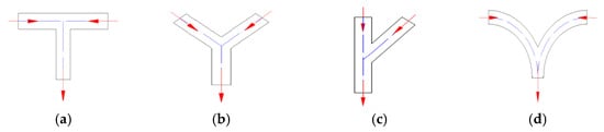 Schematic diagram of the structure of confluence pipelines with different shapes. (a) T shape; (b) Y shape; (c) bifurcated; and (d) arc shape.