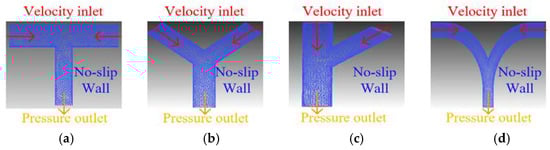 The inlet–outlet configurations of confluence pipelines with different shapes are shown in Figure 2. For the T-shaped pipeline, the left and right sides are water inlets, the vertical direction is a water outlet, and the cross-sectional areas of the inlet and outlet are equal. For the Y-shaped confluence pipeline, the left and right sides are water inlets, the vertical direction is a water outlet, the cross-sectional areas of the inlet and outlet are equal, and the angle between the two water inlets is 45°.
