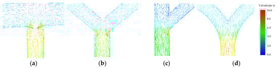 Vector graph of the velocity distribution of fluid particles. (a) T shape; (b) Y shape; (c) bifurcated; and (d) arc shape.