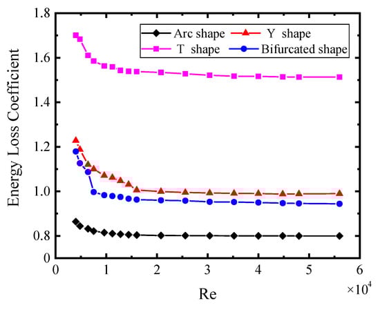 We conducted CFD simulation analysis on different pipelines under Reynolds numbers of 4000, 4800, 6400, 7520, 9600, 11,200, 12,800, 14,400, 16,000, 20,800, 25,600, 30,400, 35,200, 40,000, 44,800, 48,000, and 56,000. Figure 5 shows the energy loss coefficient of the confluence pipelines with different structures. The energy loss coefficient of the confluence pipeline with different structures gradually decreases with the increase in Reynolds number and ultimately tends to be stable. Under the same conditions, the energy loss coefficient of the arc confluence pipeline is the smallest, followed by the energy loss coefficient of the bifurcated confluence pipeline and the Y-shaped confluence pipeline, and the energy loss coefficient of the T-shaped confluence pipeline is the largest. In light of the above results, the following section will focus on the experiments performed on the arc confluence pipeline.