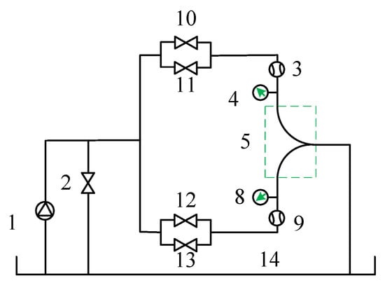 Schematic diagram of the experimental system. 1. Submersible pump; 2. bypass ball valve; 3 and 9. intelligent electromagnetic flowmeter; 4 and 8. intelligent pressure transmitter; 5. arc manifold; 10 and 13. branch ball valve; 11 and 12. fine adjustment ball valve; and 14. water tank.