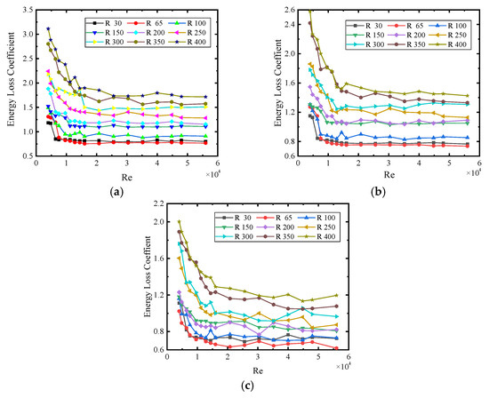 Figure 7 shows that, with the gradual increase in the curvature radius of the arc confluence pipeline, the value of its energy loss coefficient first decreases and then tends to be stable, and its change law is similar to that of energy loss along the path. For arc confluence pipelines with different curvature radii at the same Reynolds number, the energy loss coefficient decreases first and then increases gradually with an increase in curvature radius. When the curvature radius is 65 mm, the energy loss coefficient is at its minimum value. In the range of 4000 < Re < 56,000, the value of the energy loss coefficient increases with an increase in the curvature radius of the arc confluence pipeline. When the radius of curvature is constant, the energy loss coefficient decreases with an increase in Re, and when Re > 20,000, the energy loss coefficient ultimately remains unchanged.