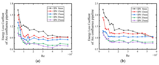 Figure 8 shows the energy loss coefficient of arc confluence pipelines with different pipe radii, which indicates that the energy loss coefficient of an arc confluence pipeline with different diameters of 100 mm and 200 mm curvature radius decreases with a gradual increase in pipe diameter. Therefore, for an arc confluence pipeline with the same curvature radius, when the Reynolds number is one, in order to reduce the energy loss during confluence, the pipe diameter can be appropriately increased.