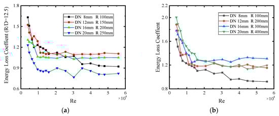 Energy loss coefficient of arc confluence pipelines with different pipe radii: (a) R100 mm and (b) R200 mm.