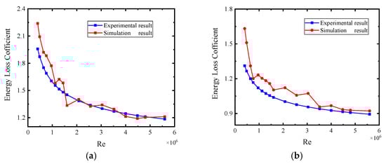 An error comparison was made between the simulation results of the energy loss of the DN8 mm circular arc bus and the experimental measurement results, as shown in Figure 10. The maximum relative error is 24.43% and the minimum relative error is −0.63% from the theoretical calculation and experimental results of the energy loss coefficient of the circular arc bus tube with different curvature radii of tube diameter.