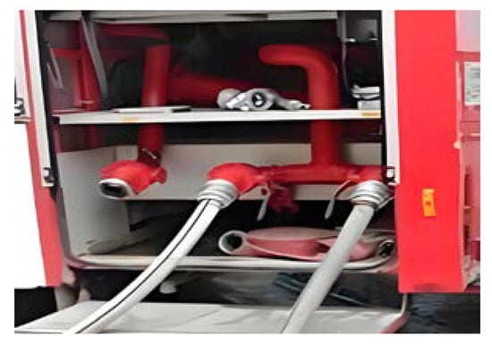 As shown in Figure 11, the PSP1500 car-mounted fire pump produced by AMPRO is equipped with a standard T-shaped manifold with a diameter of 150 mm. The water pump inlet pipeline is designed with a water inlet at two sides. However, during the performance testing of the vehicle water pump, whether it is a single-sided water inlet or a simultaneous water inlet on both sides, it cannot meet the design requirements of the water pump very well. According to analysis, this is caused by the influence of local resistance on the direction of water inflow. Therefore, the structure of the inlet pipe was changed by using two 90° curved pipes to connect and form a curved confluence pipe, as shown in Figure 11. Then, when tested again, it could easily meet the design requirements for pump performance flow rate and pressure. The impact of the structure with water inflow on both sides on the performance of the fire truck pump cannot be ignored.