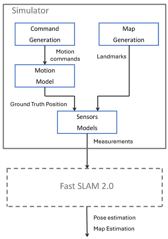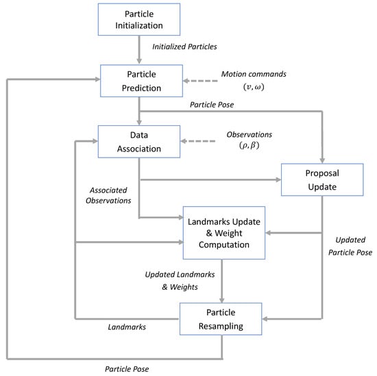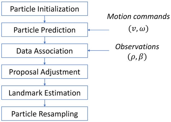 This work focuses on particle filter-based algorithms, specifically FastSLAM 2.0, based on Landmark-Based Maps. FastSLAM 2.0 leverages a Rao–Blackwellized particle filter where the robot’s pose and the map estimations are decoupled. In more detail, the robot pose estimation is first predicted according to the motion model and the control inputs, then adjusted considering the latest associated observations. On the other hand, each landmark position is estimated using an extended Kalman Filter. Further details on FastSLAM 2.0 are discussed in Section 2.