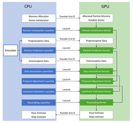 The rest of this paper is organized as follows. Section 2 provides theoretical background and discusses the state-of-the-art regarding the data association and the resampling problems. In more detail, Section 2.1 discusses the elements of the FastSLAM 2.0 method, Section 2.2 tackles the data association problem, and the resampling problem is discussed in Section 2.3. Section 3 describes the hardware and software setup: Section 3.1 provides the specification of the hardware, Section 3.2 and Section 3.3 summarize the main characteristics of the CUDA programming paradigm and the PyCUDA library, and Section 3.4 addresses the memory access management. Section 4 describes our evaluation methodology, including the simulation environment (Section 4.1), the partitioning of the pipeline into functional blocks (Section 4.2), the analysis of the parameter dependencies (Section 4.3), and the time gain evaluation (Section 4.4). Section 5 tackles the main characteristics of the functional blocks’ parallelization. Section 6 is dedicated to the experimental results and discussions thereabout and Section 7 draws the conclusions of this contribution and discusses future developments.
