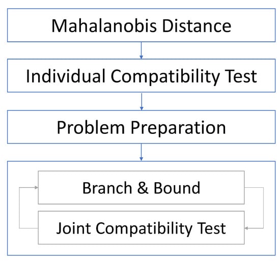 The Joint Compatibility Branch and Bound (JCBB) algorithm [] was selected to carry out the data association task in our implementation. JCBB can handle multiple observations simultaneously and reduces the number of possible observation–landmark matches by performing a chi-square compatibility test based on the joint quadratic Mahalanobis distance between the observations and the landmarks. After the joint compatibility test is performed, the feasible pairings are evaluated and selected according to the branch-and-bound method. The validity of using a joint compatibility test within the data association step has been demonstrated in [].