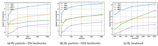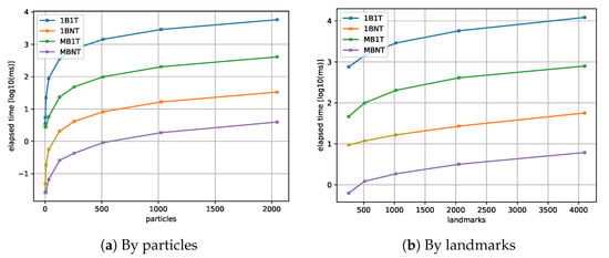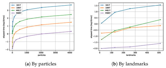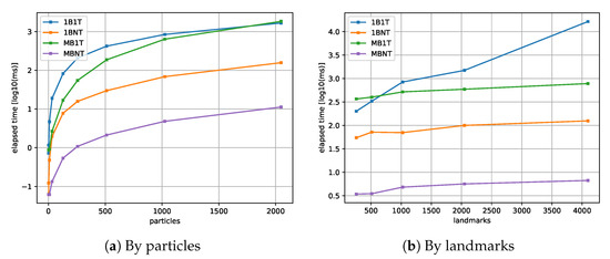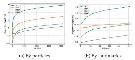 One of the main limitations of SLAM approaches is their high computational complexity, and particle filter-based methods are no exception. In addition, SLAM should often run on onboard devices and guarantee real-time pose estimation. In this context, parallel programming and devices enabling massive parallelization, such as Graphic Processing Units (GPUs), can enable many SLAM methodologies to meet real-time constraints [,,,,]. PF-based approaches can particularly benefit from acceleration via parallel programming due to their modular structure. In fact, particles are calculated independently and, within each particle, the landmark poses are also independently estimated. In this context, the most commonly adopted acceleration modality in the literature is particle-wise parallelization, as in [,,,,]. Some proposals focus the acceleration efforts on specific steps of the pipeline, such as data association [,], resampling [,,], and particle weight computation []. As for FastSLAM 2.0, a few works provide parallelized implementations on the edge. An accelerated implementation for FPGA is available in [], while a parallelized implementation of the algorithm for the OMAP4430 architecture is available at []. To the best of our knowledge, the only parallelized implementation of FastSLAM 2.0 on a GPU device is discussed in [], where a particle-wise parallelization for monocular inertial SLAM is proposed. The FAST Corner Detection method carries out the data association step on the CPU.