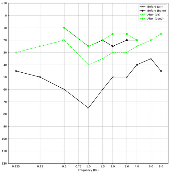 The target values of our prediction are postoperative hearing intensities made at the same frequencies as the preoperative hearing intensities, as pure-tone audiometry is typically performed before and after the surgery at the same standard frequencies. Both BC and AC hearing intensities were predicted to allow an estimation of the full postoperative audiogram. An example of the hearing improvement reflected in the audiogram measurements is shown in Figure 1.