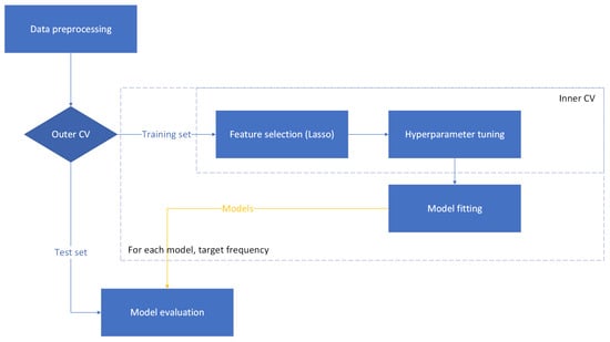 The nested CV process is illustrated as a flow diagram in the Figure 3. Nested CV consisted of outer 4-fold CV and inner 3-fold CV. Standard selection for scaling and Lasso for feature selection were applied on the training data of given folds (in the process of inner or outer CV) to allow comparability to the hold-out method. The inner CV was responsible for feature selection and hyperparameter tuning. The best features and parameters were extracted from the inner CV, fit on the outer CV training data, and evaluated on the outer CV test fold. Naive methods were added as described in Section 2.4 and computed in the outer CV loop.