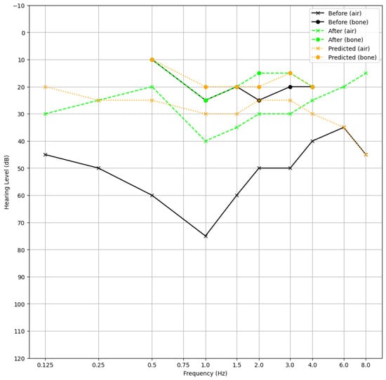 Air and bone conduction hearing intensities—before and after procedure. This graph contains the same sample as Figure 1, only the predictions of our models are added (orange).