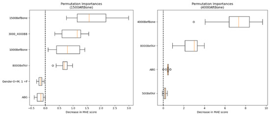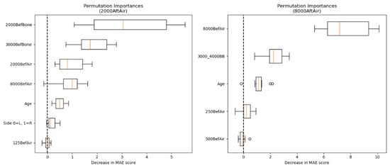 PFI box plots show a decrease in MAE when randomly permuting each individual feature. If the model performs the same or better when a feature is randomly permuted, this indicates that the feature does not provide significant value to the prediction. Figure 5 contains a side-by-side comparison of the PFI for predicting AC hearing intensity at frequencies 2000 and 8000 Hz. The most significant features in the prediction of AC targets at 2000 Hz were the BC values at frequencies 2000 and 3000 Hz. A considerable impact was also observed for AC hearing intensities at frequencies 2000 and 8000 Hz, and age. Ear side and 125 Hz AC value had a negligible effect on prediction.