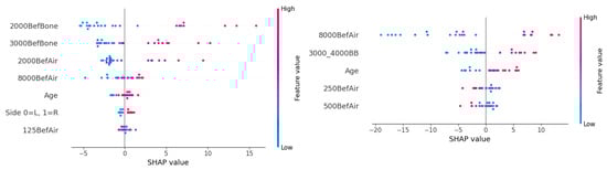 Young age also had a better prognosis for the prediction of postoperative AC hearing at 8000 Hz. Higher feature values for AC hearing at 8000 Hz and combined BC hearing at 3000 and 4000 Hz had high SHAP values, causing worse postoperative hearing. Low values of AC hearing intensity at 8000 Hz show a significant impact on postoperative hearing. If low dB hearing intensities were observed preoperatively, they are likely to remain low postoperatively. Interestingly, for AC hearing at 250 and 500 Hz, the opposite influence can be observed—the model predicted lower (better) postoperative hearing intensity for individuals with worse preoperative hearing. However, the validity of this finding is questionable, as these two features have a limited impact on successful prediction (see Figure 5).