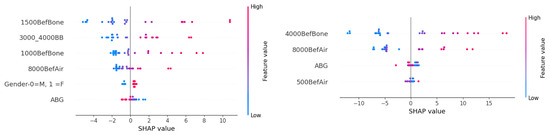 Figure 7 presents a side-by-side comparison of the PFI for predicting BC hearing intensity at frequencies of 1500 and 4000 Hz. The most significant feature in predicting the postoperative BC hearing intensity at 1500 Hz was the preoperative BC value at the same frequency. Other useful features were the combined BC hearing intensities at 3000 and 4000 Hz, as well as the BC hearing at 1000 Hz and AC hearing at 8000 Hz. The gender and ABG of patients had a negative impact on successful prediction based on PFI.