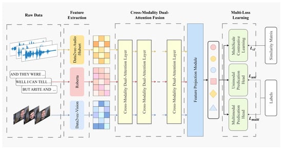 The overall architecture of the CMDAF. For the raw data, the network obtains unimodal features by pre-training feature extractors. The architecture comprises the following three essential components: the cross-modality dual-attention fusion module, the feature projection module, and the multi-loss learning module.