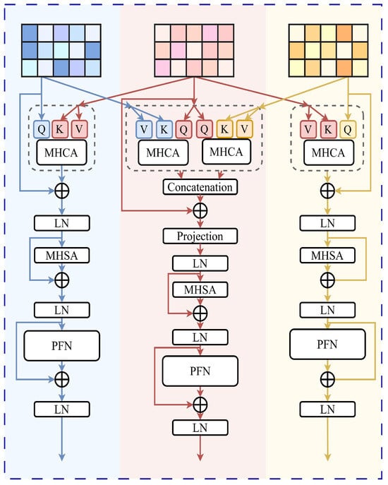 The main goal of MSA focuses on rich modal fusion representations from multimodal features. As shown in Figure 2, we propose the cross-modality multi-head dual-attention module, which comprises both multi-head dual-attention and self-attention components. It addresses the heterogeneity problem in multimodal data and captures the intra-modality and inter-modal correlations. The module contains N layers, enabling the network to perform multi-level feature fusion. Specifically, primary multimodal feature fusion is conducted in the shallow layers, whereas advanced multimodal fusion takes place in the deeper layers. Since textual modality is more instructive for multimodal sentiment analysis [,], we do not apply the dual-attention mechanism equally to the three modalities but mainly use textual modal features to guide the other modality’s features for cross-modality interaction.