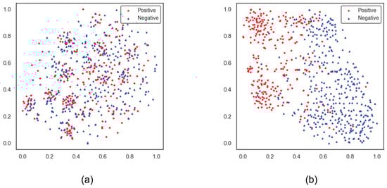 Extracting richer modal features from the raw data significantly enhances the overall performance of our approach. To assess the efficacy of feature extraction using the pre-trained model, we visualize the representations obtained through various extraction methods. Using the MOSI dataset as a case study, we select all samples in the test set, excluding those with neutral annotations. Figure 4a illustrates the modal representation from the standard MOSI preprocessing. In contrast, Figure 4b presents the feature representations generated by our proposed method, highlighting the improvements achieved. It is evident that the clustering of features from the samples extracted using our method is more pronounced. This observation underscores the enhanced effectiveness of our approach in the extraction of sample features.