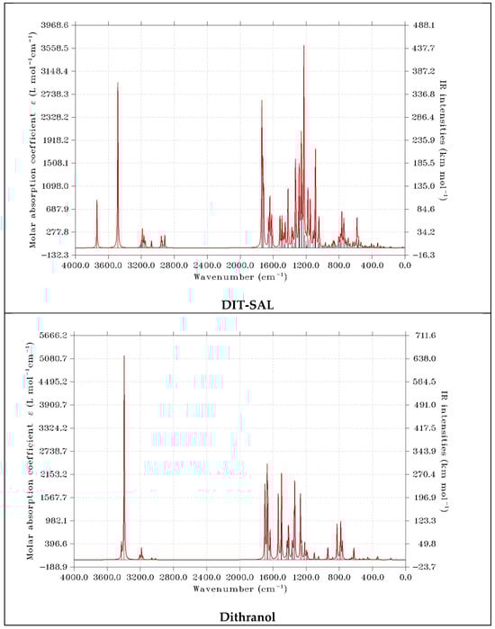 Comparison of infrared spectra of DIT-SAL, dithranol, salicylic acid, and molecules.