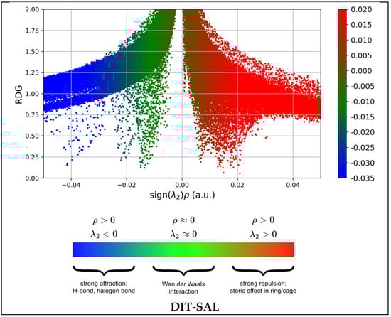 - (sign λ2)ρ ≃ 0: van der Waals forces, which arise from overlapping electron clouds and occur over larger distances. The colored RDG scatter plots in Figure 16 were prepared using Multiwfn 3.7 software and plotted using Gnuplot version 5.4.