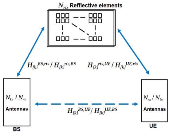 Illustration of a mMIMO communication system aided by RIS, consisting of BS, UE, and RIS with Nris-reflecting elements.