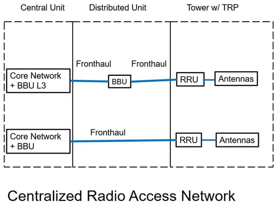 Operators of 5G mobile networks (MNOs) are looking to adopt open, virtualized, C-RAN networks for greater network flexibility and cost savings. MNOs have been moving their networks from physical hardware to virtual and cloud-based software deployments since 4G. This step towards virtualization is well underway for the core network. This goal is also valid for the RAN of 5G and B5G. Cell site antennas have remote radio unit (RRUs) connecting to the central office where the baseband unit (BBU) is localized, with the option of intermediate distributed units with intelligence processing, as shown in Figure 2. The processing power distribution between BBU and RRU depends on the specific use case and scenario. As shown in Figure 2, each transmission and reception point (TRP) is equipped with one uniform planar array (UPA) of antennas per sector.