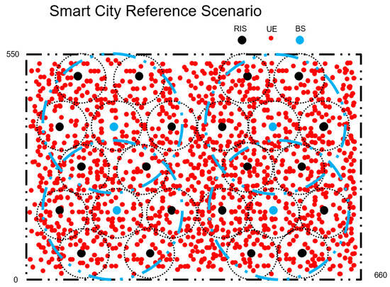 For the smart city scenario, we consider only the uplink, wherein IoT devices are transmitting to BS and RIS at the same time. Uplink power control is appropriately applied so that the received powers are the same for almost all IoT devices. However, data sent from IoT devices that are too far from the receivers, i.e., BSs and/or RISs, might not be well received. There is a minimum received power that must be above the receiver sensitivity so that packets are correctly received. We take as a reference the BER ≤ 5 × 10−4 to decide which packets are received without bit error. For numerology 0 of 5G NR, Δf = 15 KHz and 168 subcarriers are being transmitted in every PRB during 1 ms. The minimum throughput of each IoT device is 2 Kbps, assuming transmission in one carrier with QPSK symbols, and the minimum spectral efficiency per IoT device is ℇu = 2/15 bps/Hz. There is a theoretical equation for the maximum throughput, assuming perfect power control and a single cell with no inter-cell interference [], which is