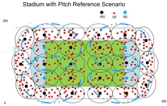 Users are placed uniformly around TRPs localized close to the four corners of the stadium turf. Some 46% of users are on turf, while the remaining 54% are sitting in the stadium stands (see Figure 4 and Table 2). The configuration with 100%BS + 0%RIS has 4 BSs and 12 sectors and matches a typical cellular system. In this case, users are uniformly distributed within a radius of 57 m (see Table 2). On the other hand, when simulating cases with BSs and RISs operating simultaneously, users that are connected to BSs will be uniformly distributed within a circle with a radius of 34 m. RIS panels are uniformly distributed inside the scenario, and users served by RISs are distributed uniformly within a radius of 17 m.