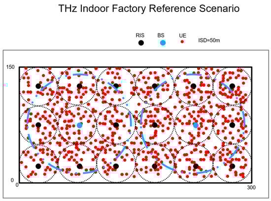 The indoor factory deployment scenario focuses on high user throughput or user density in factories. This scenario represents indoor factories with a total volume of 300 m × 150 m × 10 m. There are two sites with three TRPs, meaning one per sector. The ISD of this scenario is 150 m. In this case, the BS antenna height can be 2 m (low height) or 8 m (high height). It is also an interference-limited scenario. The carrier frequency is 100 GHz (sub THz band). We have chosen only highly clutter-dense factories. The minimum bandwidth is 400 MHz. Variable number of users per cell are distributed uniformly, and the exact number of users depends on the number of physical resource blocks received by each one. Full buffer model is assumed. The layout of this scenario is illustrated in Figure 5.