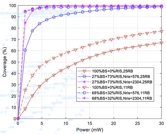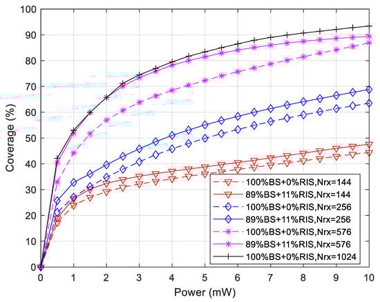 Figure 9 presents the coverage versus transmitted power for Nu = 19,800 with the same conditions as Figure 8. The comparison between Figure 8 and Figure 9 shows that there is a direct correspondence between the throughput performance and the associated coverage. For the maximum transmitted power of 10 mW, the smallest coverage of 44% is achieved by the curve 100%BS + 0%RIS, Nrx = 144, whereas the highest coverage is 93% which is obtained by the curve 100%BS + 0%RIS, Nrx = 1024. Thus, the maximum coverage gain is 111%. The next highest coverage of 90% corresponds to the curve 89%BS + 11%RIS, Nrx = 576 and represents a coverage gain of 104% that includes a reduction in the number of antennas but the introduction of RIS. Still, the main contribution to the coverage gain is due to the number of antennas, which is 97%.