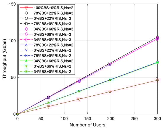 In Figure 10, the throughput performance versus the number of users in the stadium scenario is shown. The throughput curves of Figure 10 were obtained with a maximum transmitted power of 250 mW. The total number of users in each sector is determined by the total number of subcarriers divided by the required number of subcarriers to achieve the specific bit rate. For Bt = 400 MHz and numerology 3, there are a total of 3300 subcarriers for data transmission. We kept the maximum number of subcarriers at 3300 to avoid intra-cell (sector) interference. When we consider 11 PRBs per user, i.e., Nc = 132, the maximum number of users per sector is 3300/132 = 25. When RISs are inserted in the border of the sector, a proportion of the 25 users are assigned to them. In this scenario, there are 12 sectors and four BSs, each one with 3 sectors. The total number of served users at the same time in the Stadium is 25 × 12 = 300. Two different RIS sizes appear, since each RIS panel is divided into sub-panels when serving more than one user. We have NRIS = 192 and 576 elements. When users are served with a direct link only from BS (100%BS + 0%RIS), we have a total average throughput of approximately 48 Gbps for 300 users (represented as a red line). In the stadium, there are 22 × 3 = 66 RIS panels and 4 × 3 = 12 TRPs. Considering the black and blue lines, when users at cell borders start to be served by RIS panels, 66 users from 300 (i.e., 66/300 = 0.22) must be subtracted, resulting in 300 – 66 = 234 users (i.e., 234/300 = 0.78) who are served by 12 TRPs, 78%BS + 22%RIS. For the pink and green lines, when 66 × 3 = 198 users are served by RIS 198/300 = 0.66, the remaining 300 – 198 = 102 users (i.e., 102/300 = 0.34) are served by TRPs, 34%BS + 66%RIS. We observe that the throughput gain of curves with Ns = 3 compared to Ns = 2, is 1.5. There is no difference in throughput between users served by an RIS (0%BS) and users served by a BS (0%RIS). If more users are served by RIS panels (66%RIS), there is a throughput decrease compared to curves with fewer users (22%RIS), which is only noticeable for Ns = 3 (curves black and pink). For Ns = 2, there is no decrease in throughput when more users are served by the same RIS panel (curves blue and green). Note that in all curves, there is no decrease in throughput for increasing Nu, because C-RAN operation combines transmitted signal power to RIS and BS, decreasing substantially inter-cell interference. We are also assuming perfect CSI in link-level results, and there is no intra-cell interference, as explained above.