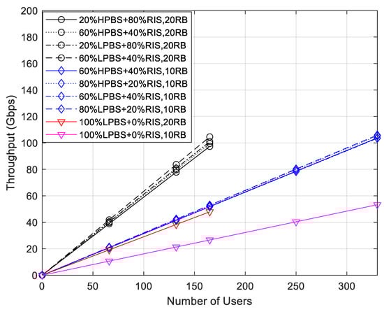 In Figure 11, the throughput performance versus Nu is shown for the stadium scenario, with two different maximum transmitted powers from BSs. Low-power BSs (LPBSs) transmit 250 mW, and high-power BSs (HPBS) transmit 3.16 W. We keep the maximum number of subcarriers of 3300 to avoid intra-sector interference. We assign 10 PRBs per user, i.e., Nc = 120, and 20 PRBs per user, Nc = 240. With 10 PRBs to each user, 3300/120 = 27.5 is the number of users per sector. The total number of served users in the stadium at the same time is 27.5 × 12 = 330. With 20 PRBs to each user, there are 3300/240 = 13.75 users per sector. The total number of users served at the same time in the stadium is 13.75 × 12 = 165. When users are exclusively served by the TRPs of BSs with direct links, i.e., 100%BS + 0%RIS, we have a total throughput of approximately 53 Gbps for 330 users (the pink line), and a total throughput of 48 Gbps for 165 users (the red line). Considering the case of 10 PRBs (blue lines), when 66 users at cell borders are served by an RIS (i.e., 66/330 = 0.20), the remaining 330 – 66 = 264 users are served by TRPs, (i.e., 264/330 = 0.80), 80%BS + 20%RIS,10RB. When 66 × 2 = 132 users are served by an RIS (i.e., 132/330 = 0.40), the remaining 60% users are served by TRP 60%BS + 40%RIS,10RB. Assigning 20 PRBs per user (black lines), when 66 users at cell borders are served by an RIS (i.e., 66/165 = 0.40), 165 – 66 = 99 users are served by TRPs, 99/165 = 0.60, 60%BS + 40%RIS,20RB. When 66 × 2 = 132 users are served by an RIS (i.e., 132/165 = 0.80), the remaining 165 – 132 = 33 users (i.e., 33/132 = 0.20) are served by TRP 20%BS + 80%RIS,20RB. We observed only a very slight decrease in the throughput results when increasing the number of users served by every RIS panel from one to two. There is almost no difference in achieved throughput between HPBS and LPBS. There is a slightly higher throughput for LPBS that is more noticeable for 20 RBs. Throughput gains are between 97% for 10RB and 110% for 20RB.