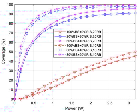 Figure 12 illustrates the average coverage versus transmitted power for both Nc = 120 (10 PRB) and Nc = 240 (20 PRB), corresponding to the throughput performance presented in Figure 11, considering only HPBS, with a maximum transmitted power of 3.16 W (35 dBm). The comparison between Figure 11 and Figure 12 indicates that there is a direct correspondence between the throughput performance of Figure 11 and the associated coverage of Figure 12. However, in terms of coverage, the differences are more noticeable than with throughput. It is noticeable that for the maximum transmitted power, the highest coverage of 99.4% is achieved by the curve 80%BS + 20%RIS,10RB followed by the curve 60%BS + 40%RIS,10RB. Next follow the curves 60%BS + 40%RIS,20RB and 20%BS + 80%RIS,20RB. It is obvious that when the number of PRBs per user doubles, the coverage decreases. It is also noticeable that doubling the number of users served by RIS panels also decreases the coverage. The lowest coverage values correspond to no RIS panels being activated, i.e., 100%BS + 0%RIS, 10RB and finally, 100%BS + 0%RIS, 20RB, with a coverage of 45.4%. The coverage gain compared to the highest coverage value with 20RB is 111% and is 98% for 10RB.