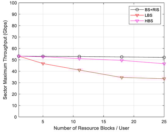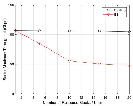 In Figure 13, we again consider the stadium scenario, presenting the aggregate throughput for each sector and considering the maximum transmit power of 24 dBm versus the number of PRBs per user. The maximum number of subcarriers is set as 3300 per sector, independently of the number of PRBs per user. We evaluate the sector throughput only for a specific number of PRBs, namely, 1 PRB, 5 PRBs, 10 PRBs, 15 PRBs and 20 PRBs. Assigning 1 PRB per user corresponds to Nc = 12, 5 PRBs per user corresponds to Nc = 60, 10 PRBs per user corresponds to Nc = 120, 15 PRBs per user corresponds to Nc = 180, and finally, 20 PRBs per user requires Nc = 240 subcarriers. The number of users per sector when each user has 1 PRB is 3300/12 = 275. In total, there are 12 sectors in the stadium; thus, there are a total of 3300 active users. For the case in which every active user has 20 PRBs, there are 3300/240 = 13.75 users per sector and the total of active users in the stadium is 165. We observe in Figure 13 that for the curve BS (100%BS + 0%RIS), there is a maximum throughput for 1 PRB, which is the same for the curve BS + RIS. For 5 PRBs and 10 PRBs per user, there is a clear linear decrease in throughput in the red curve (BS) compared to black curve (BS + RIS). The decrease in throughput continues with 15 PRBs and 20 PRBs, but in a slower way. The curve of BS + RIS has almost the same aggregate throughput per sector; however, we noticed a very slight decrease with the increasing number of PRBs. When users are transmitting a higher number of PRBs, the size of packets transmitted is higher and more likely to suffer deep fading. In this case, the link diversity of RIS + BS provided by the C-RAN is able to cope with the expected decrease in throughput.